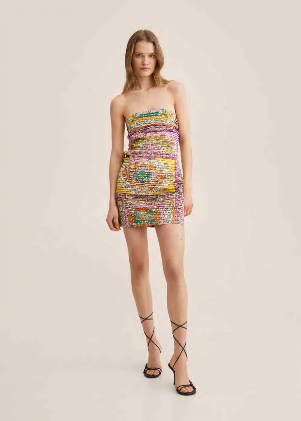 Tejido satinado Tejido plisado Estampado barroco Diseño corto Diseño entallado Palabra de honor Sin mangas Tirantes ajustables desmontables Nudo decorativo Forro interior Cierre de cremallera en la parte posterior Colección fiesta y ceremonia Exclusivo Online