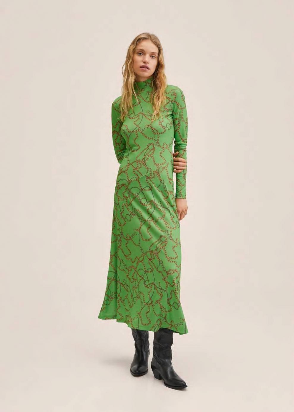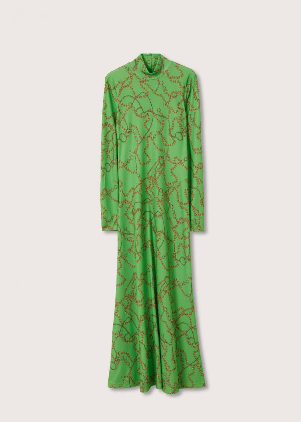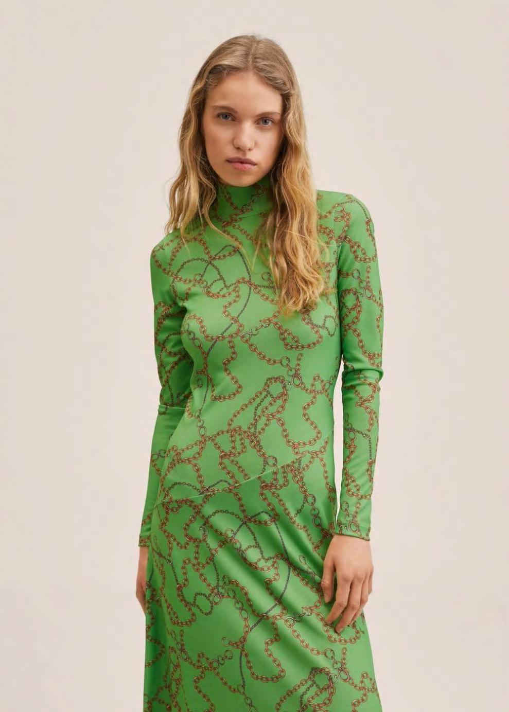 Tejido ligero Estampado de cadenas Diseño midi Diseño evasé Cuello alto Manga larga