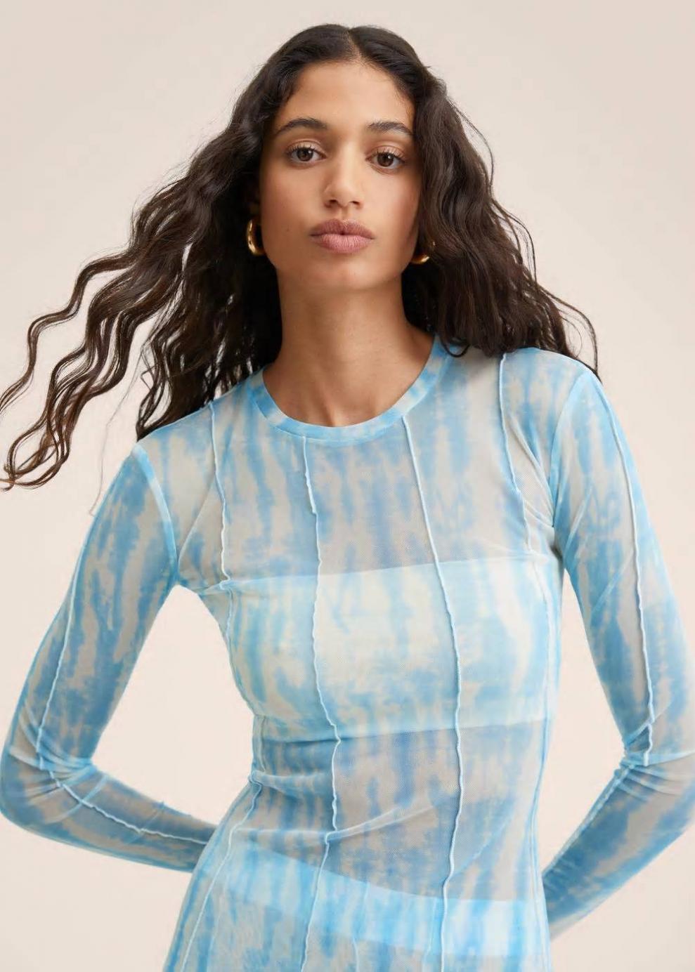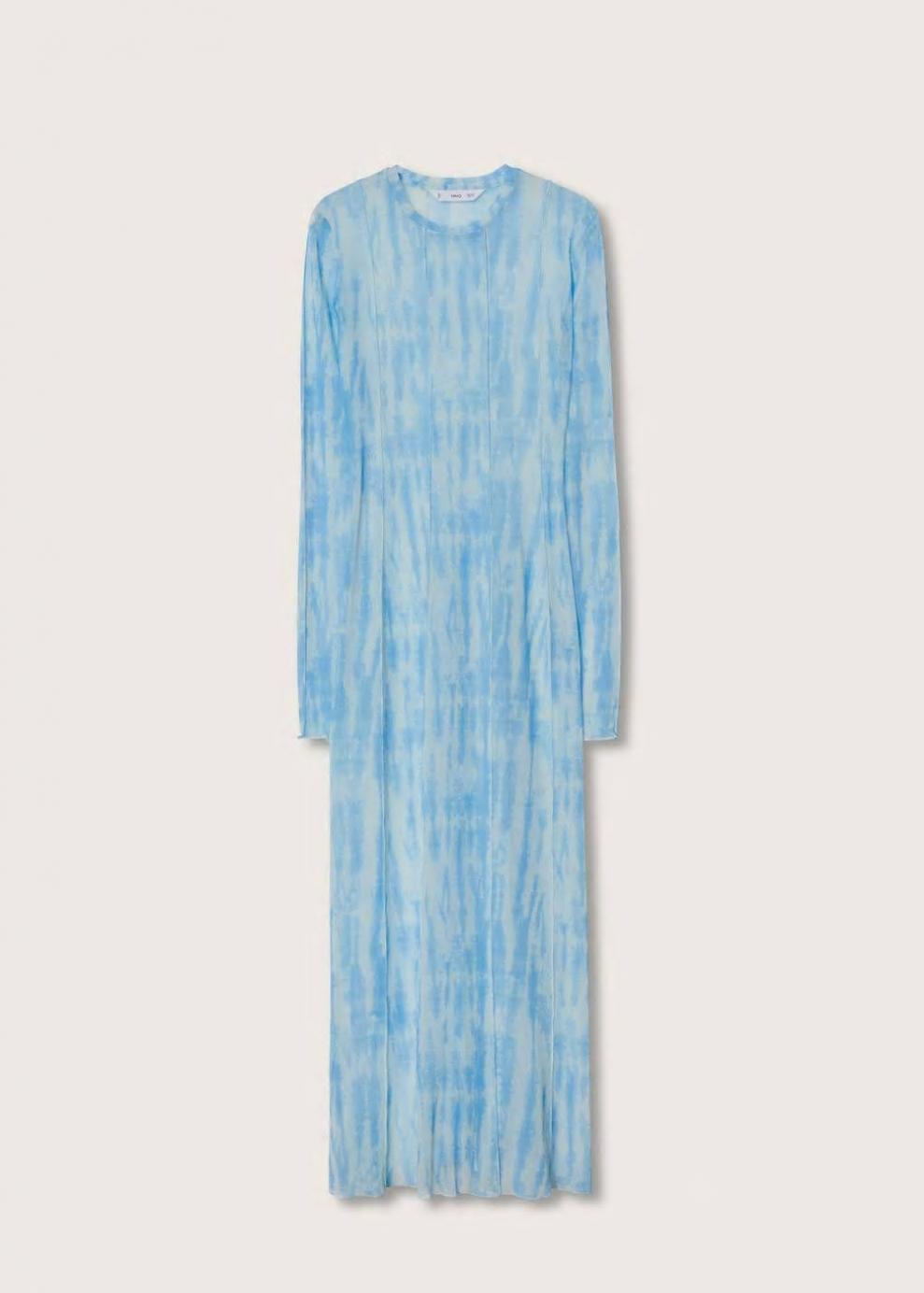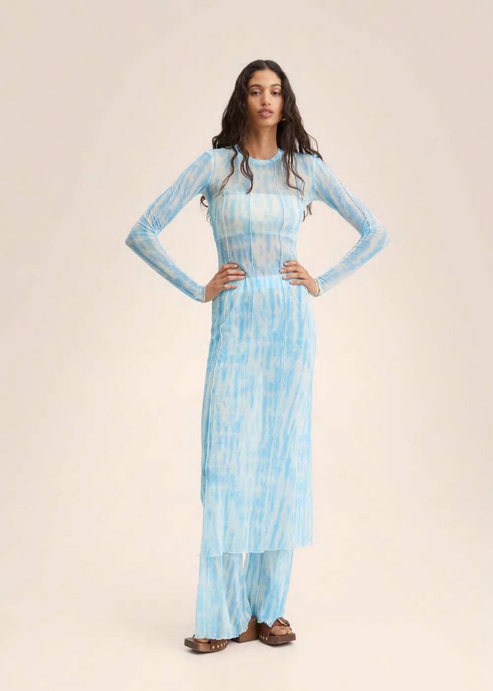 Tejido mezcla de poliéster reciclado Tejido semitransparente Diseño estampado Diseño largo Diseño entallado Cuello redondo Manga larga Costuras decorativas Sin forro interior Total look