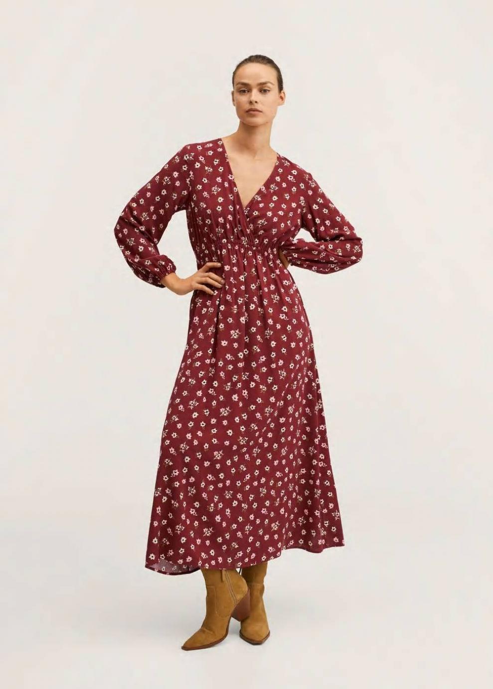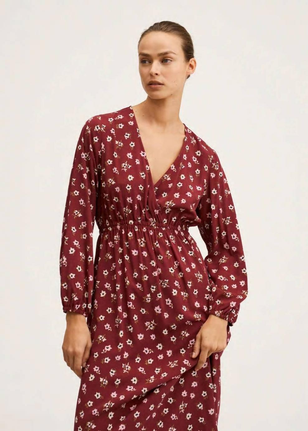 Sin cierre Cuello pico Tejido ligero Diseño largo Diseño evasé Sin forro interior Estampado floral Diseño recto Diseño midi Fruncido elástico Cuello cruzado Manga larga Las prendas etiquetadas como Committed son productos que han sido confeccionadas con fibras y/o procesos de producción sostenible, reduciendo así su impacto ambiental. El objetivo de Mango es respaldar la implementación de prácticas más comprometidas con el medio ambiente, aumentando así, el número de prendas sostenibles en su colección.