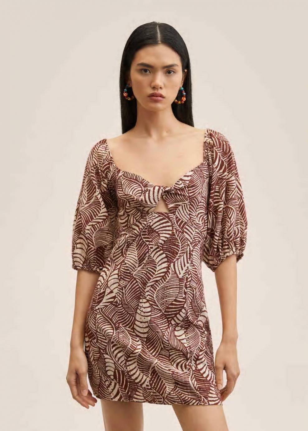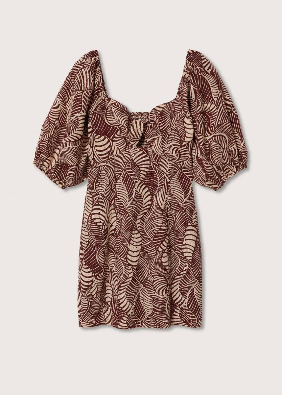 100% Algodón Diseño estampado Diseño corto Diseño recto Cuello escotado Manga corta abullonada Detalle fruncido en el escote Panel elástico Abertura en la parte delantera Detalle nudo