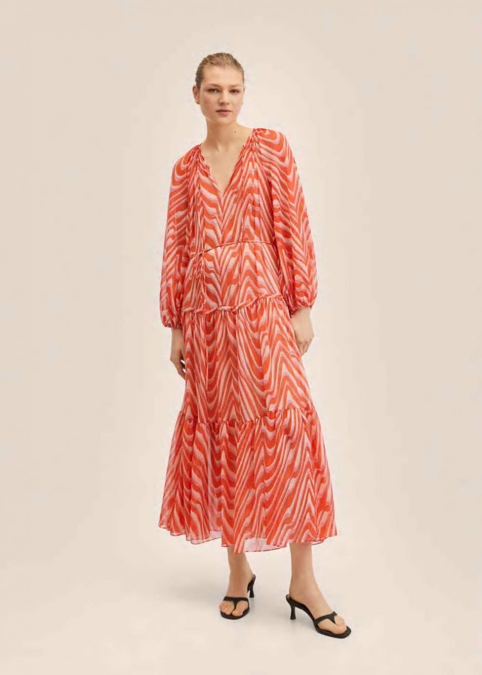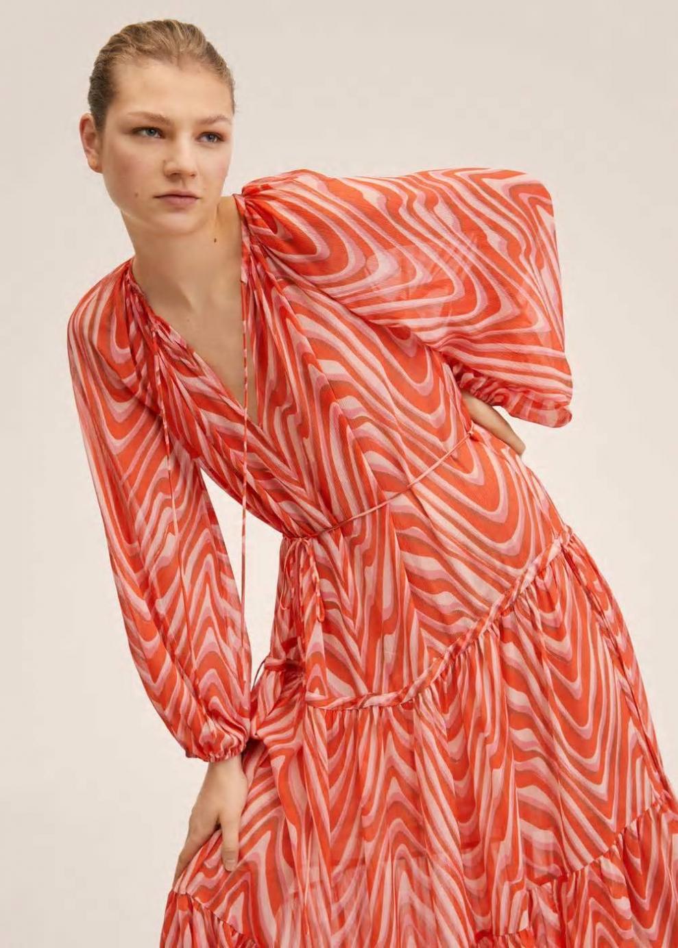 Tejido semitransparente Estampado multicolor Diseño oversize Diseño largo Diseño evasé Cuello de pico ajustable con cordón Manga larga con puños elásticos Detalles de volante en la falda Cordón ajustable Forro interior Colección fiesta y ceremonia Las prendas etiquetadas como Committed son productos que han sido confeccionadas con fibras y/o procesos de producción sostenible, reduciendo así su impacto ambiental. El objetivo de Mango es respaldar la implementación de prácticas más comprometidas con el medio ambiente, aumentando así, el número de prendas sostenibles en su colección.