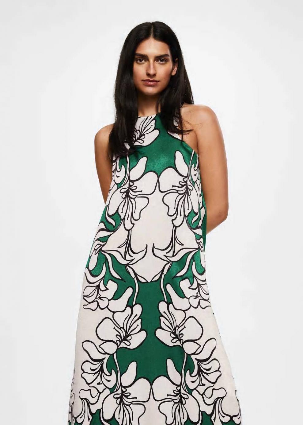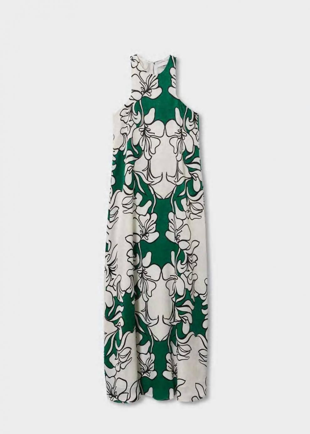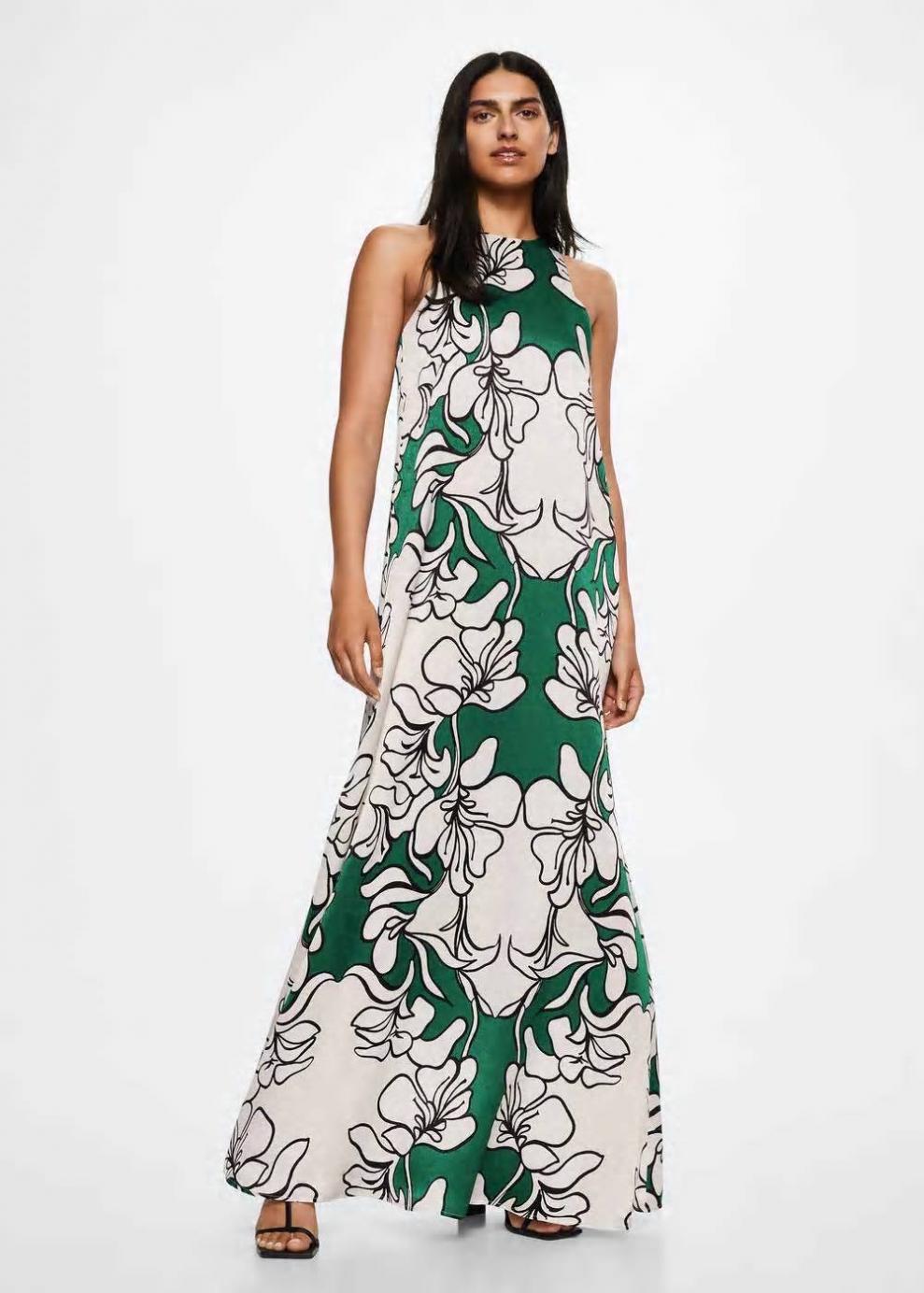 Tejido satinado Estampado de flores Diseño largo Diseño evasé Cuello halter Sin mangas Forro interior Cierre de botón en la parte posterior Colección fiesta y ceremonia