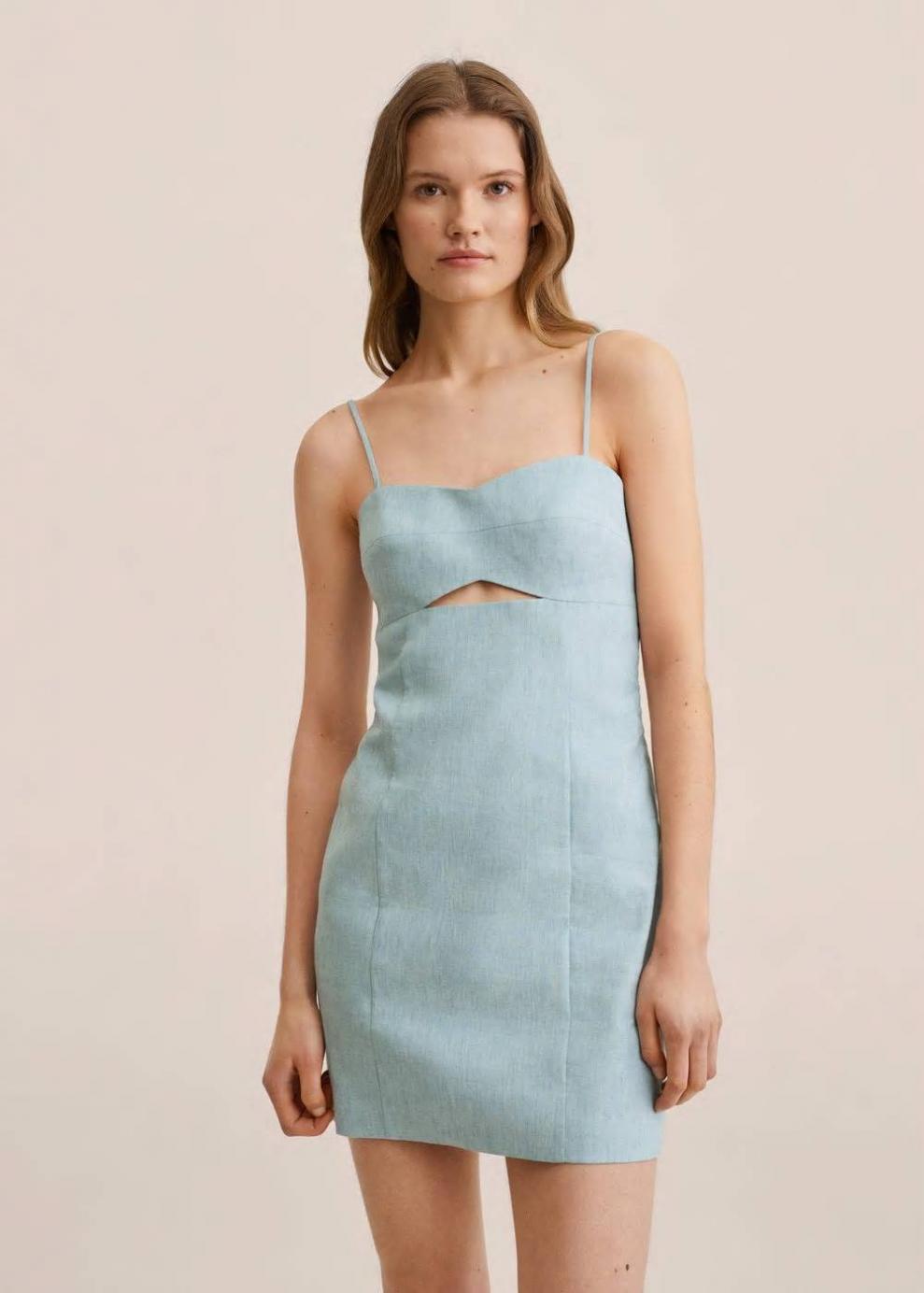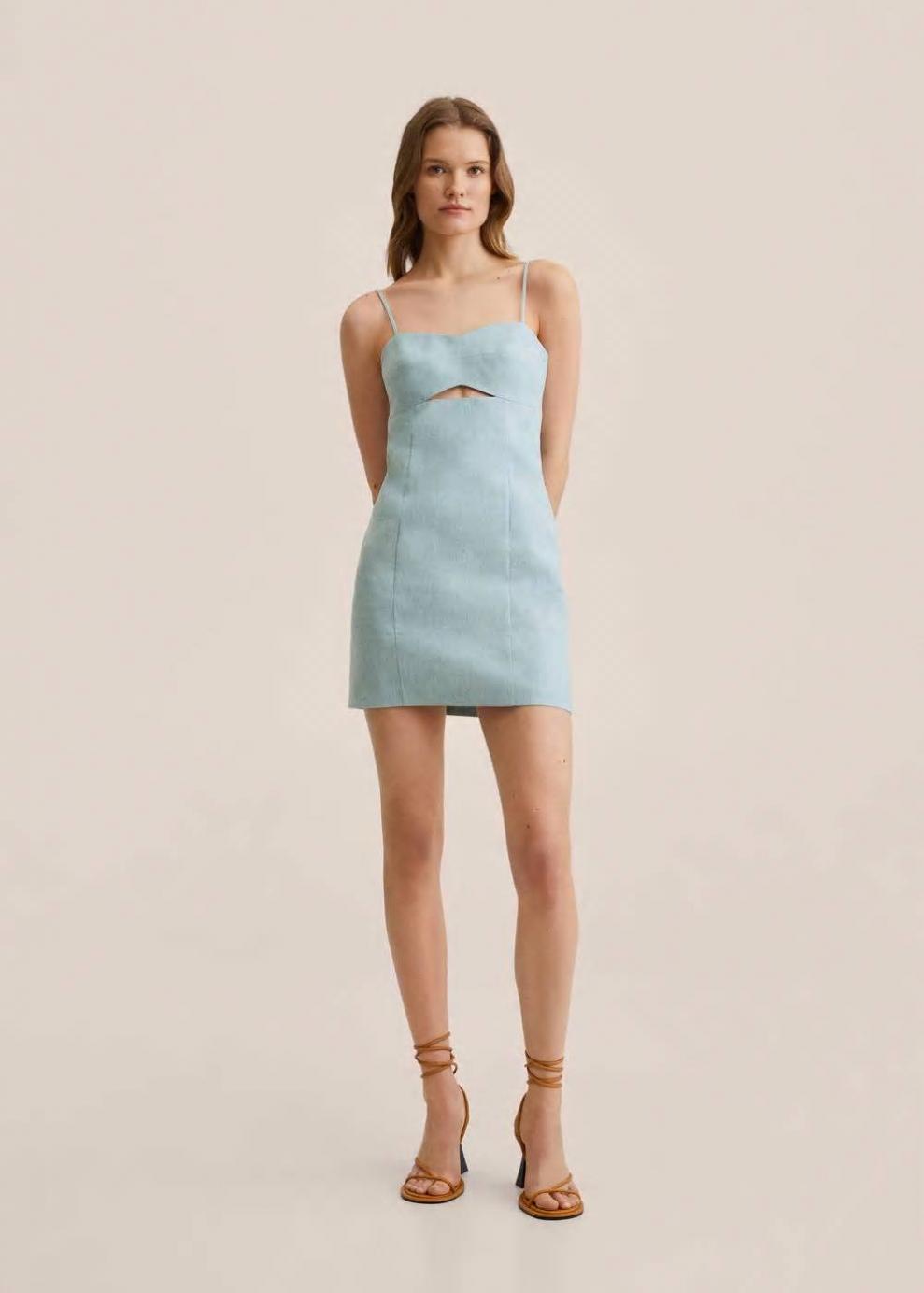 Tejido mezcla de lino Tejido con lyocell Diseño corto Diseño entallado Cuello escotado Sin mangas Tirantes finos Abertura en la parte delantera Panel fruncido Forro interior Cierre lateral de cremallera