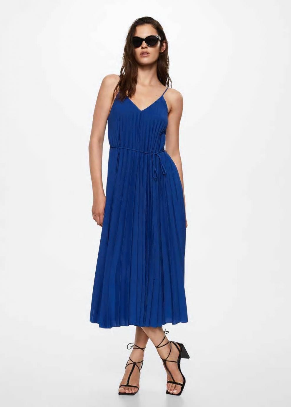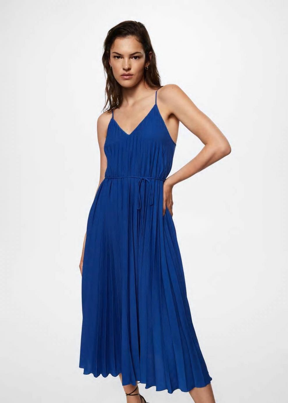 Tejido plisado Diseño midi Diseño evasé Cuello escotado Tirantes finos Cinturón desmontable Colección fiesta y ceremonia…