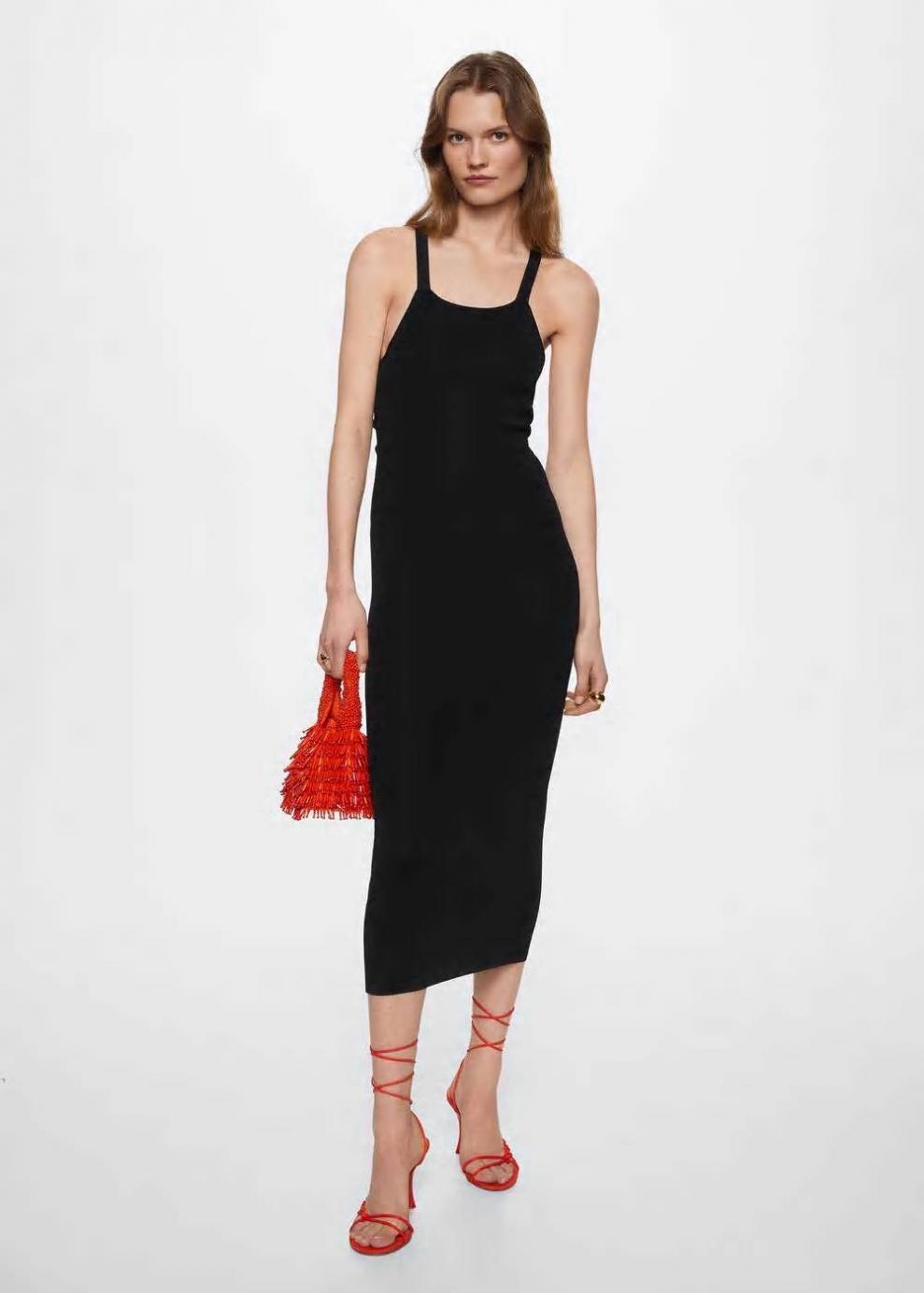 Tejido de punto fino Diseño entallado Diseño midi Cuello escotado Tirantes anchos Tirantes cruzados en la espalda Abertura en la espalda Cierre de lazo en la parte posterior Colección fiesta y ceremonia