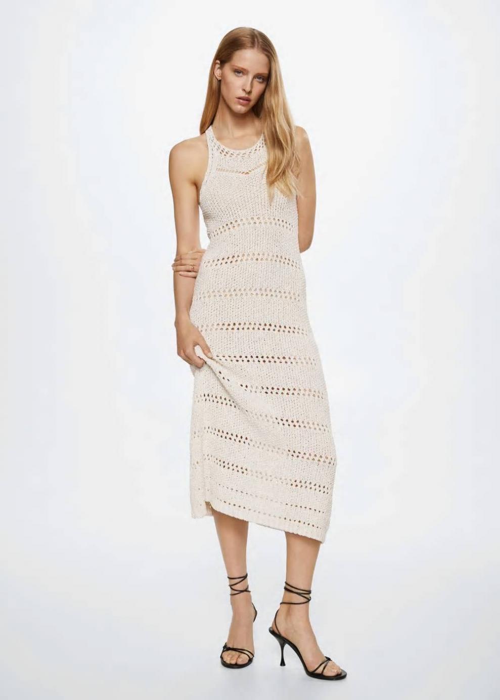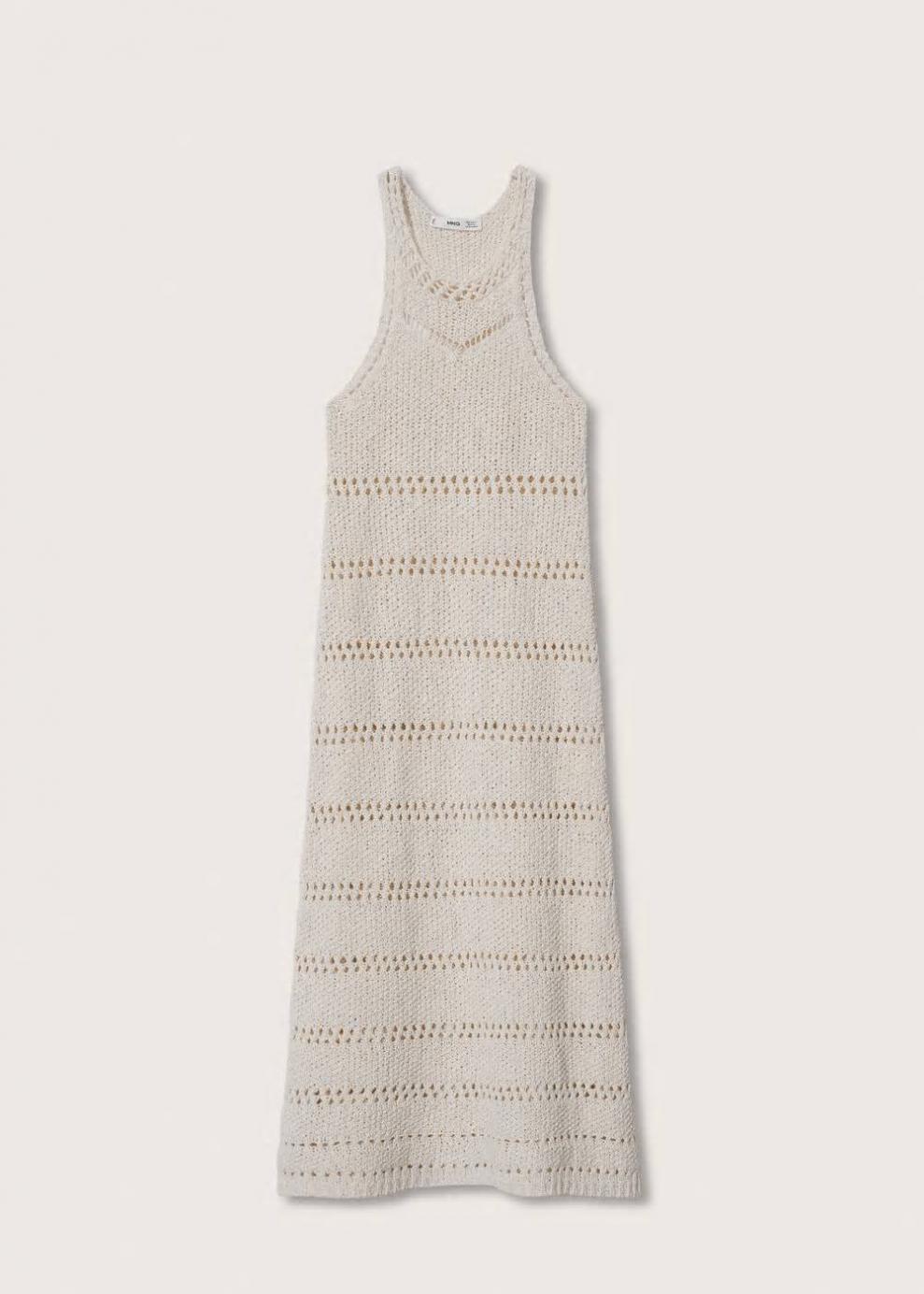Tejido de punto grueso Tejido mezcla de algodón Detalles calados Diseño recto Diseño largo Diseño semitransparente Cuello redondo Sin mangas Tirantes finos Espalda nadadora Sin forro inter…