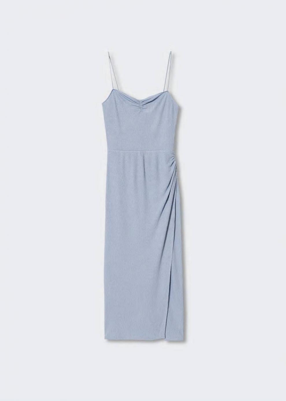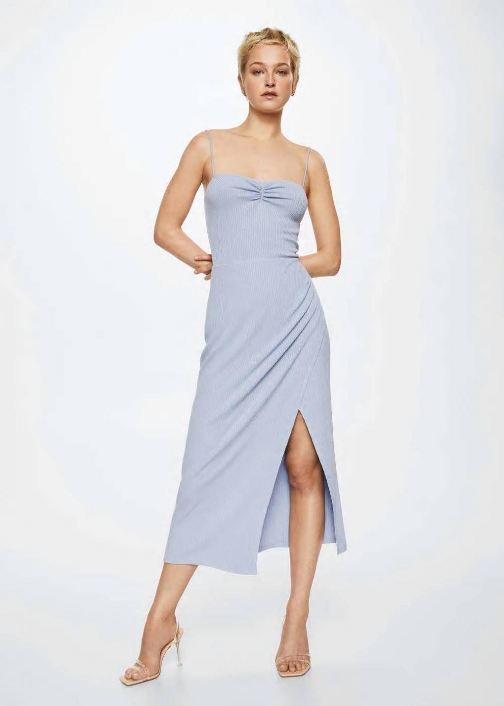 Colección Committed Tejido de punto de canalé Diseño entallado Diseño midi Cuello escotado Detalle fruncido en el escote Tirantes finos Abertura lateral Fruncido lateralColección fiesta y ceremonia Las prendas etiquetadas como Committed son productos que han sido confeccionadas con fibras y/o procesos de producción sostenible, reduciendo así su impacto ambiental. El objetivo de Mango es respaldar la implementación de prácticas más comprometidas con el medio ambiente, aumentando así, el número de prendas sostenibles en su colección.
