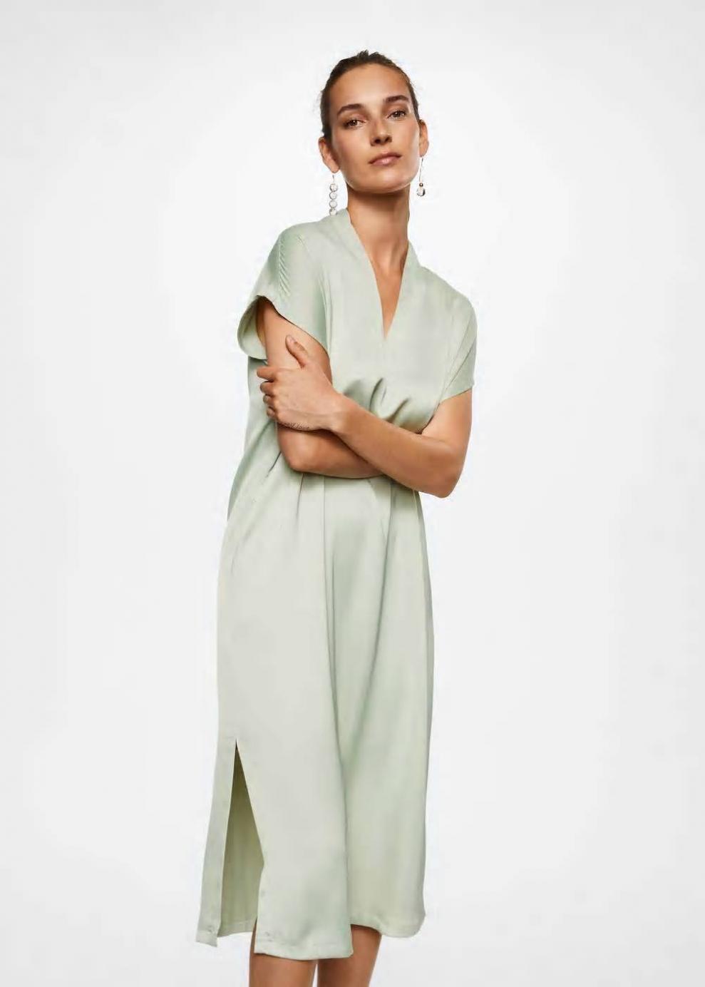 Colección Committed Tejido fluido Diseño largo Cuello de pico Manga corta Colección fiesta y ceremonia Las prendas etiquetadas como Committed son productos que han sido confeccionadas con fibras y/o procesos de producción sostenible, reduciendo así su impacto ambiental. El objetivo de Mango es respaldar la implementación de prácticas más comprometidas con el medio ambiente, aumentando así, el número de prendas sostenibles en su colección.