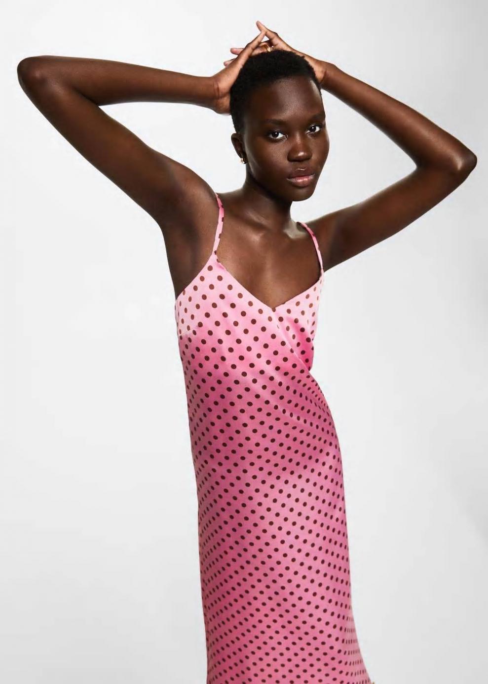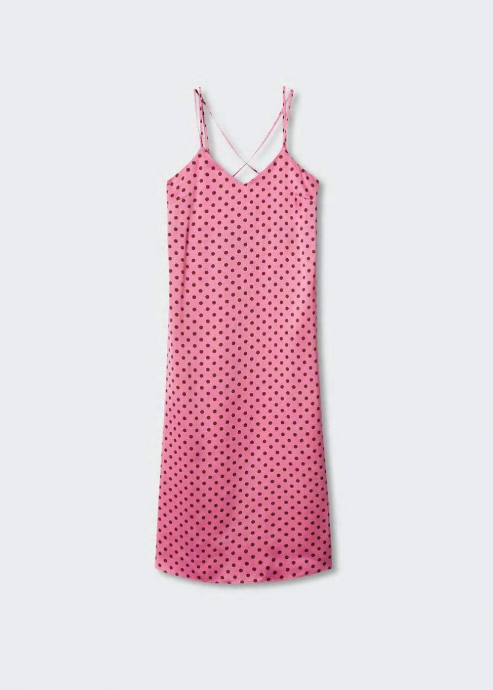 Colección Committed Tejido satinado Estampado de lunares Diseño largo Diseño recto Cuello escotado Tirantes finos dobles cruzados en la parte posterior Espalda abierta Colección fiesta y ceremonia Las prendas etiquetadas como Committed son productos que han sido confeccionadas con fibras y/o procesos de producción sostenible, reduciendo así su impacto ambiental. El objetivo de Mango es respaldar la implementación de prácticas más comprometidas con el medio ambiente, aumentando así, el número de prendas sostenibles en su colección.