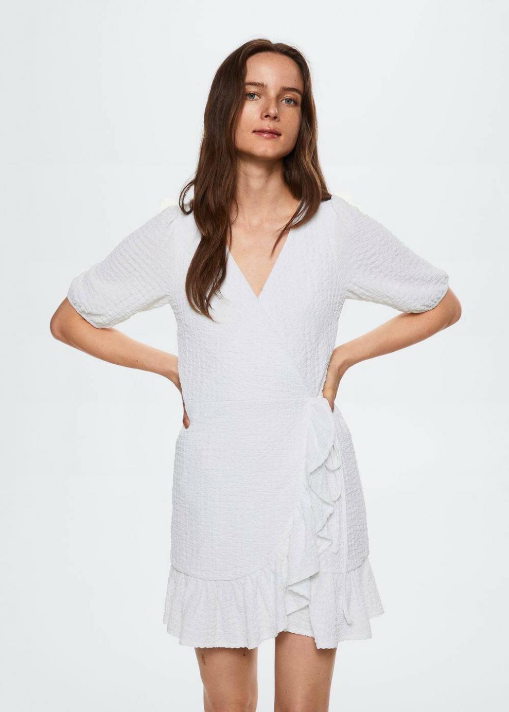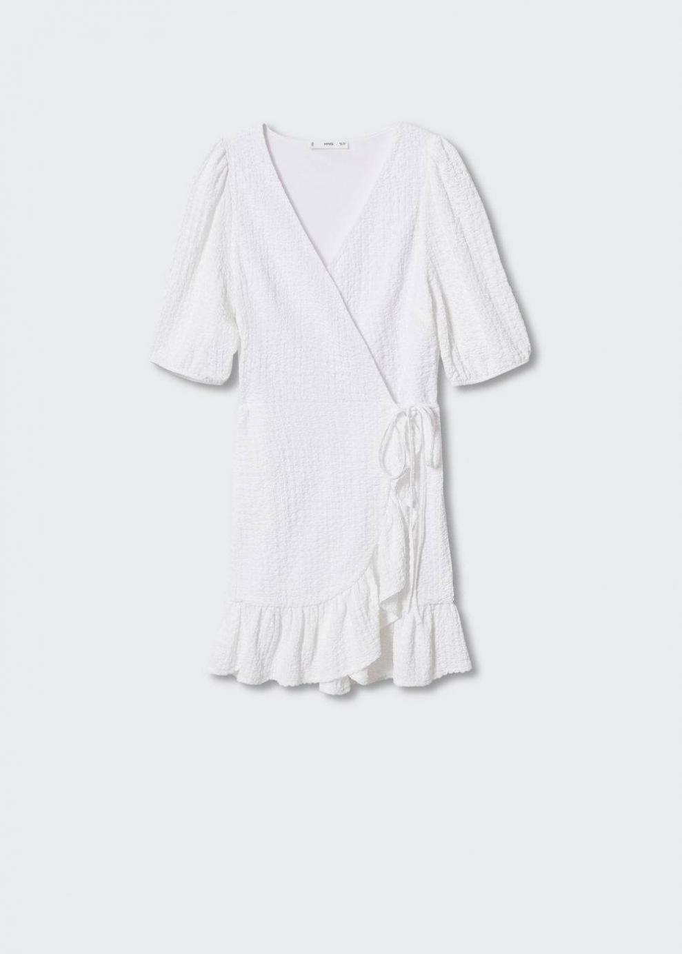 Tejido con textura Diseño corto Diseño recto Cuello cruzado Manga corta abullonada Volantes en el bajo Cierre de lazo lateral