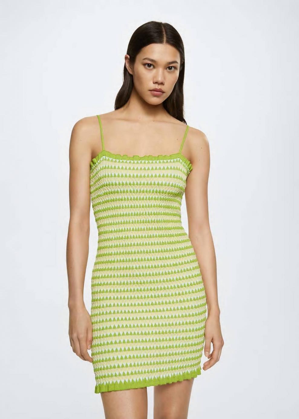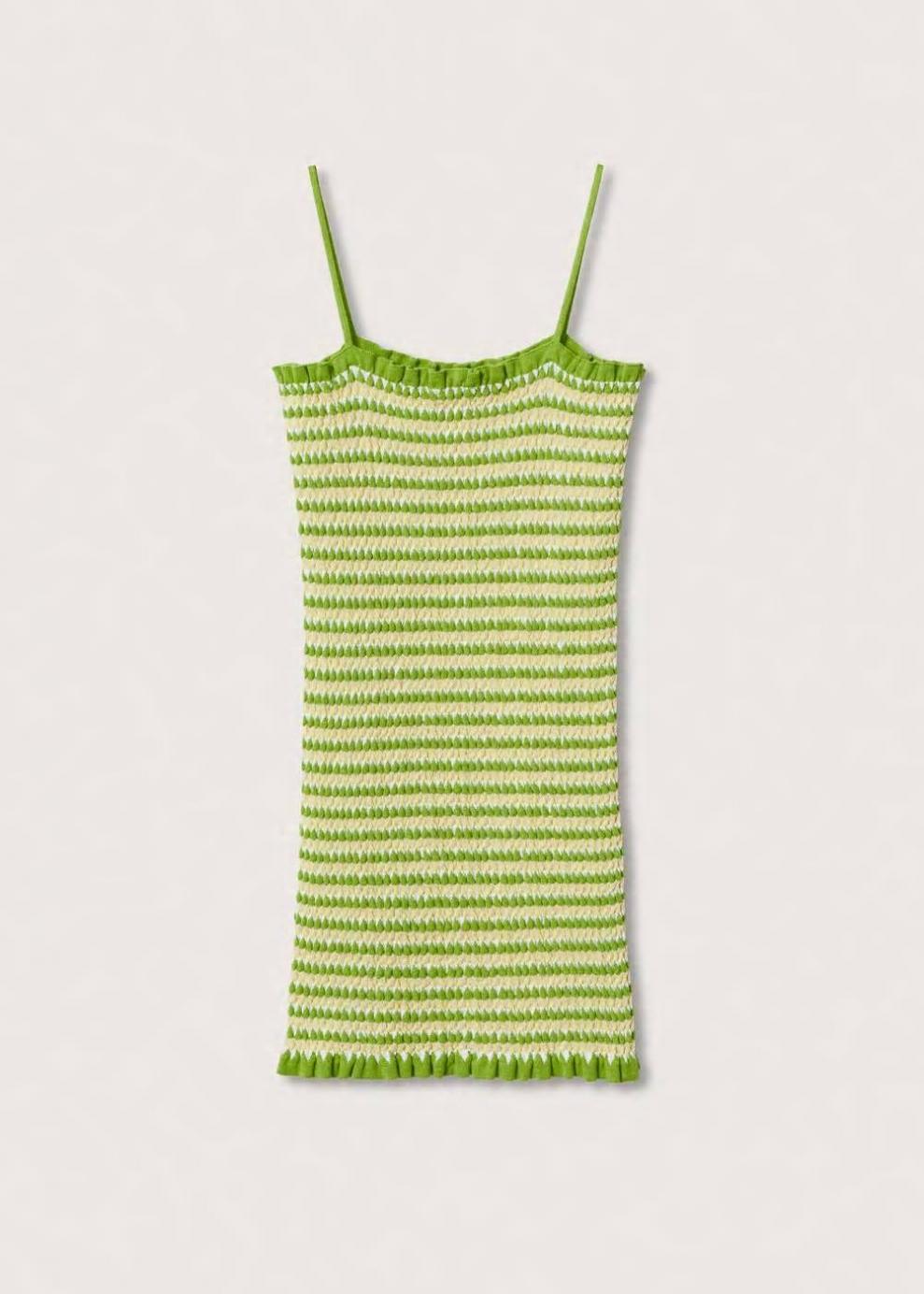 Tejido mezcla de algodón Tejido de punto fino Tejido con textura Estampado de rayas Cuello escotado Diseño entallado Diseño corto Detalle de volantes Tirantes finos…