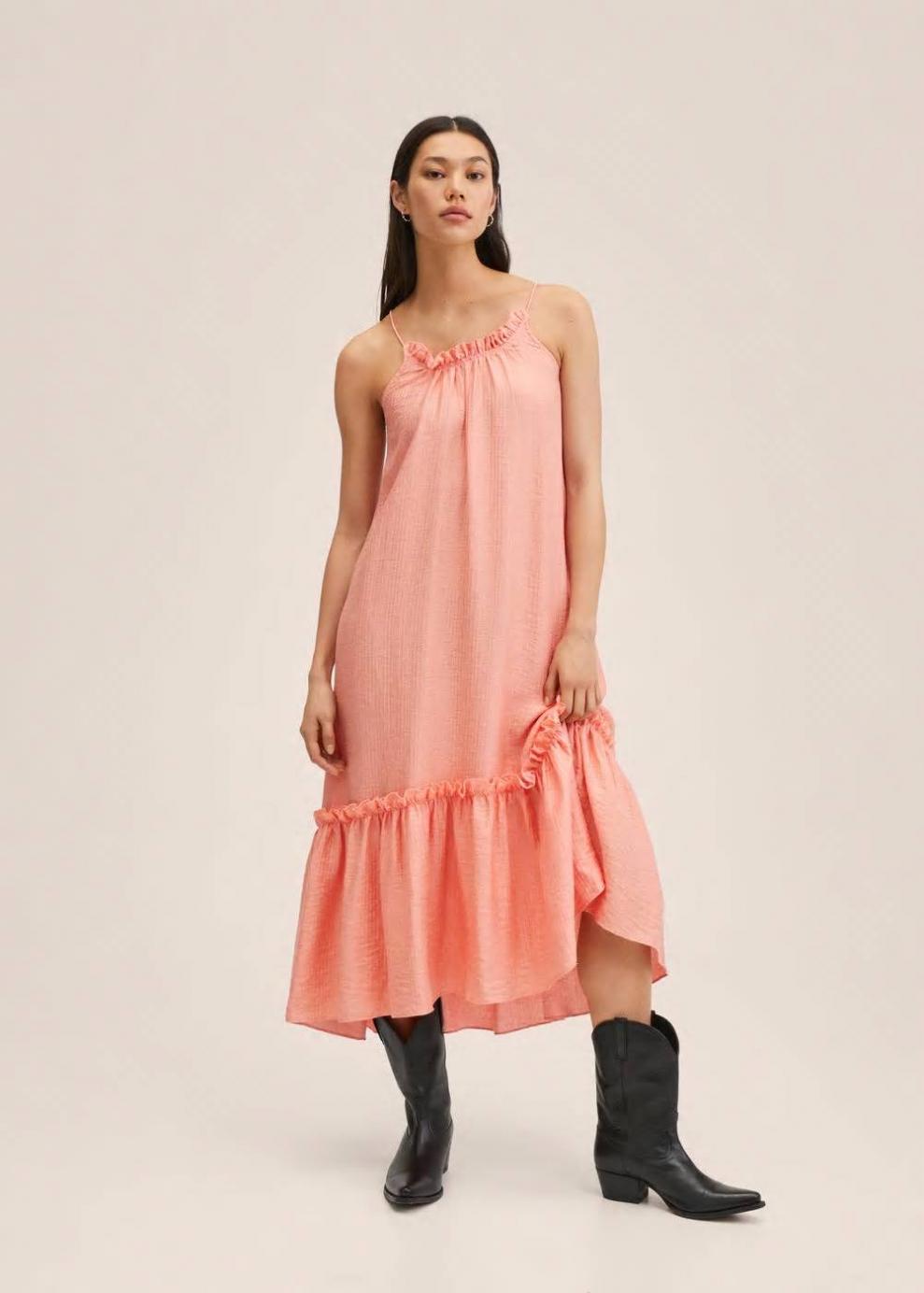 Sin cierre Tejido ligero Sin forro interior Tejido con lyocell Diseño largo Diseño evasé Diseño oversize Sin mangas Tirantes finos Cuello escotado Detalle fruncido en el cuello Volante en el bajo