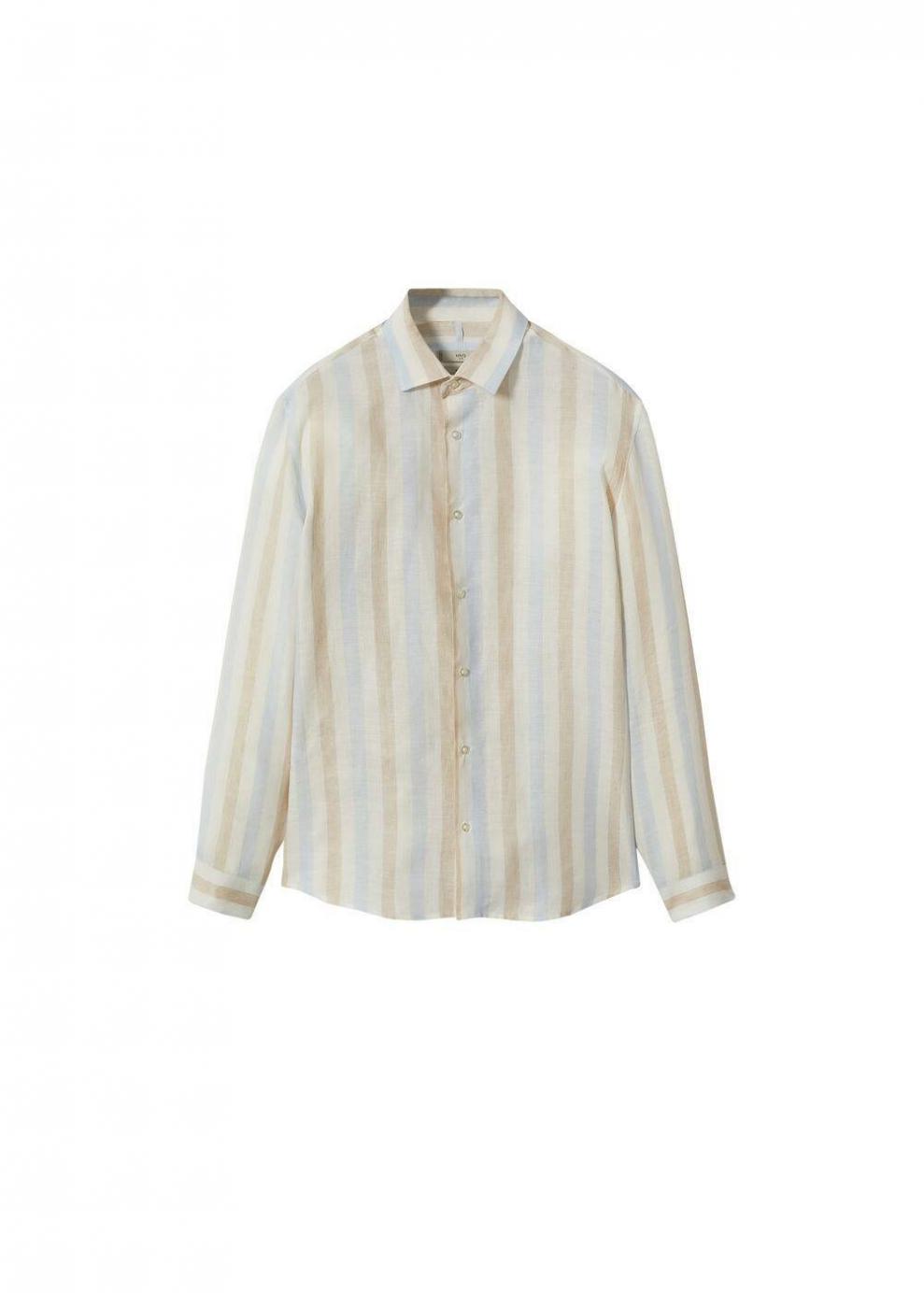 Hombre Camisa lino cuello mao rayas Beige | Camisas Mango