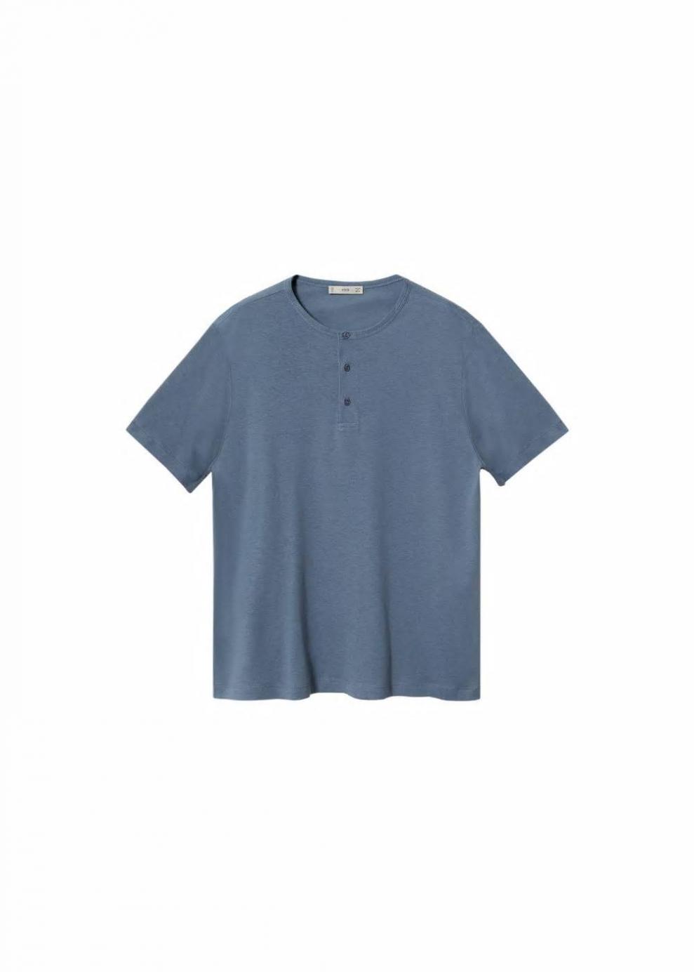 Hombre Camiseta cuello panadero lino Azul Indigo | Camisetas Mango